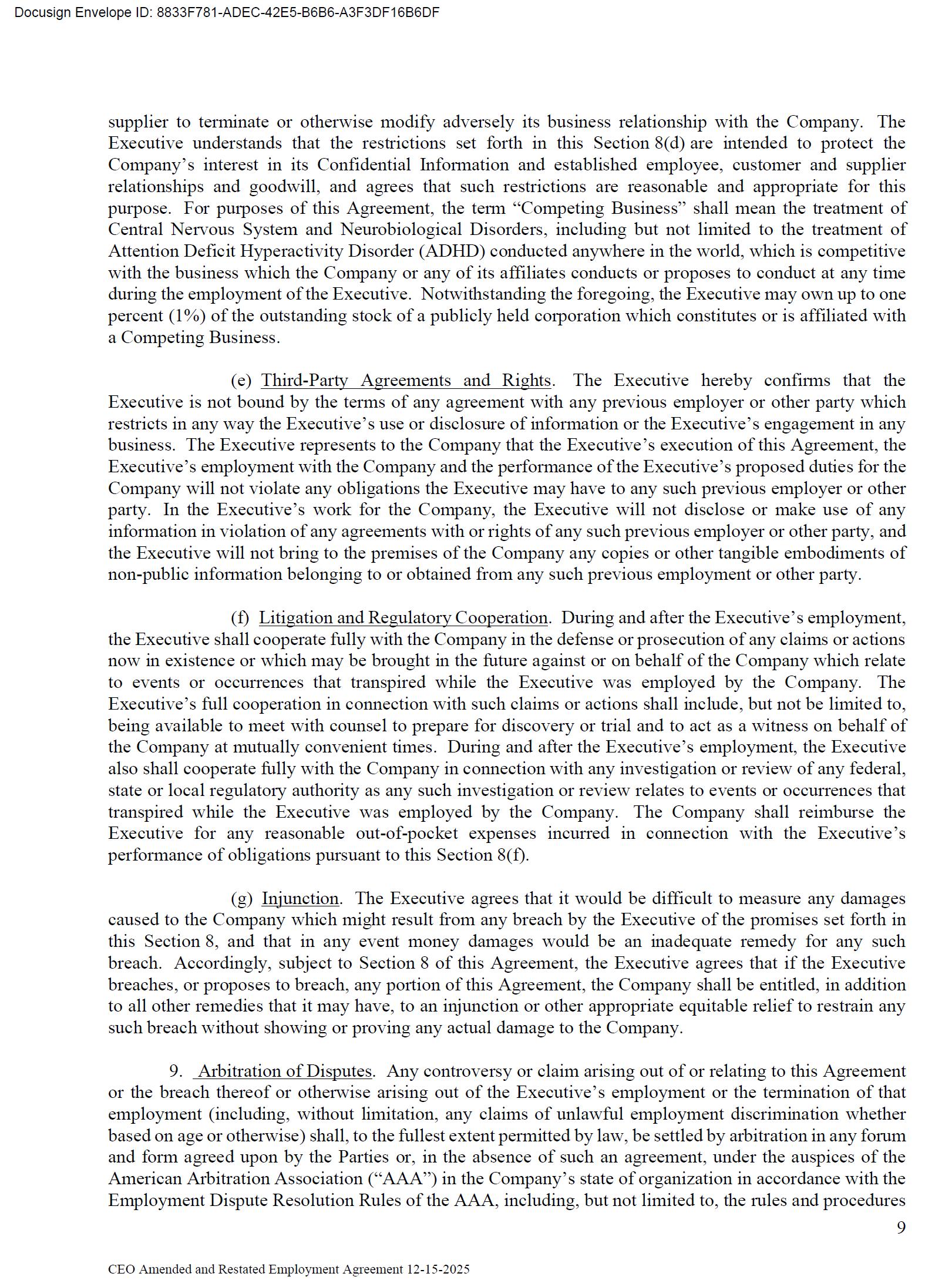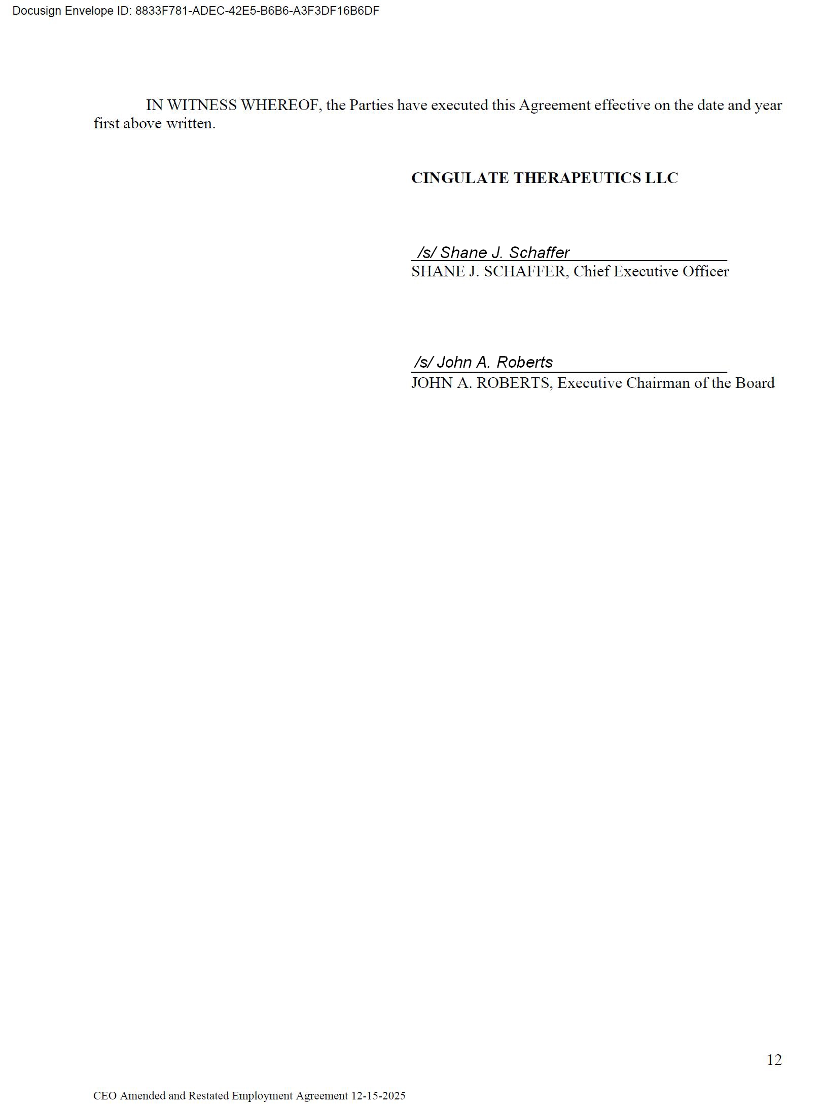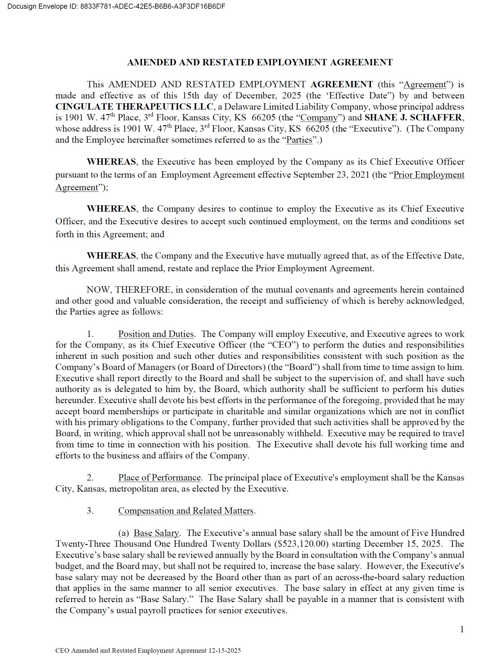 Effective December 15, 2025, Dr. Schaffer and Cingulate Therapeutics LLC, a wholly-owned subsidiary of the Company, entered into an Amended and Restated Employment Agreement (the “Employment Agreement”) and Dr. Schaffer’s base salary was reinstated from the reduced salary he received while on administrative leave. The definition of “Cause” in the Employment Agreement was modified (i) to include a determination by a court that Dr. Schaffer has violated the provisions of any court-imposed probation and (ii) to remove the requirement that certain actions by Dr. Schaffer be willful, and the number of directors required to determine whether termination is for cause was reduced from 80% to a majority (excluding Dr. Schaffer). The lump sum payment to Dr. Schaffer (i) in the event of termination without cause or with good reason was reduced to one (1) times base salary and annual target bonus and (ii) in the event of termination within twelve (12) months after a change in control was reduced to one and one half (1.5) times base salary and annual target bonus.