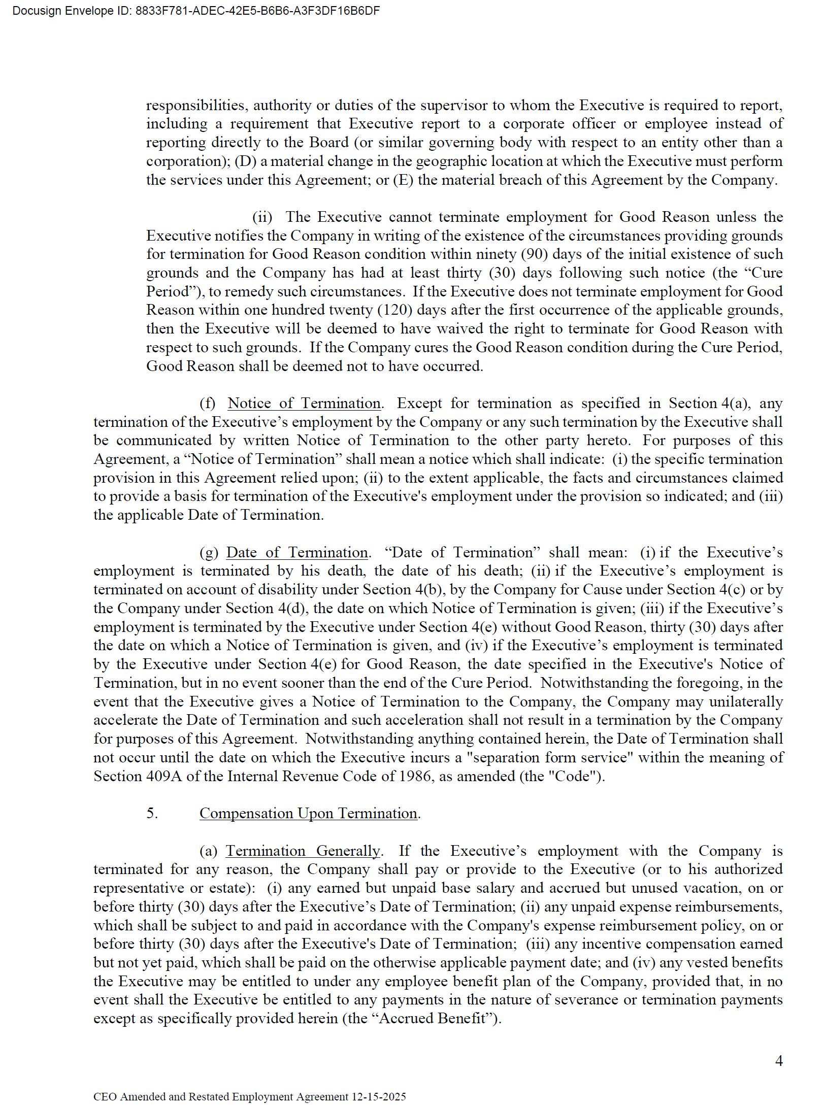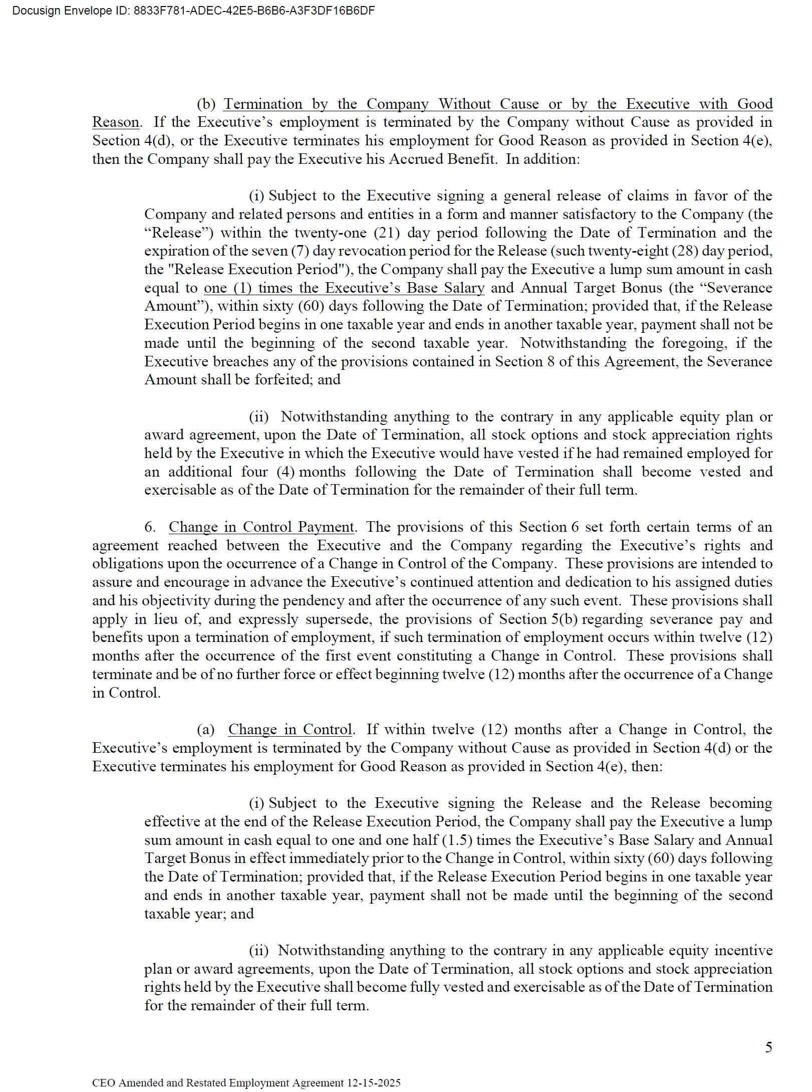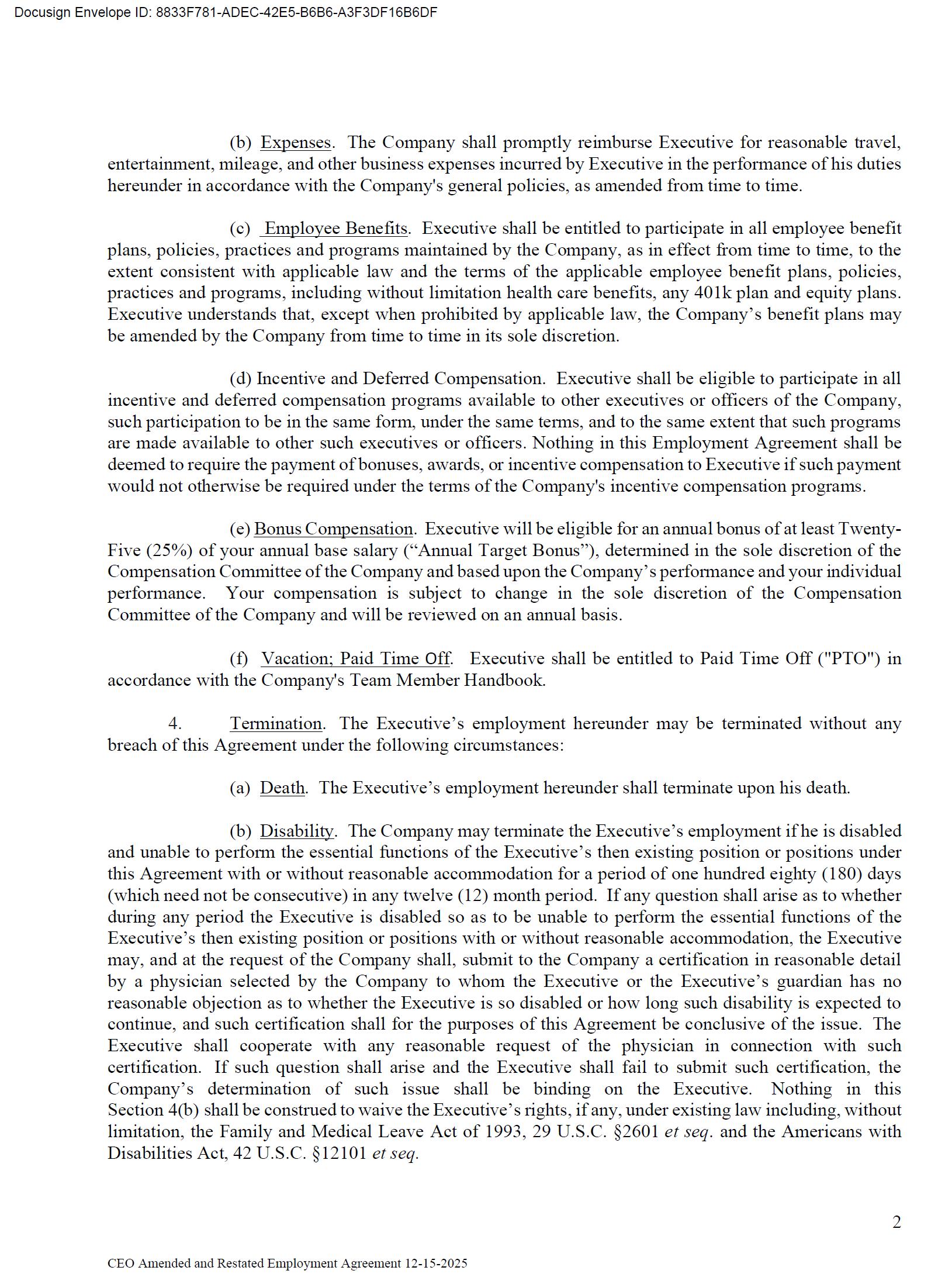 The foregoing description of the Employment Agreement is qualified in its entirety by reference to the full text of the Amendment, a copy of which is filed herewith as Exhibit 10.1 to this Current Report on Form 8-K and is incorporated by reference herein.